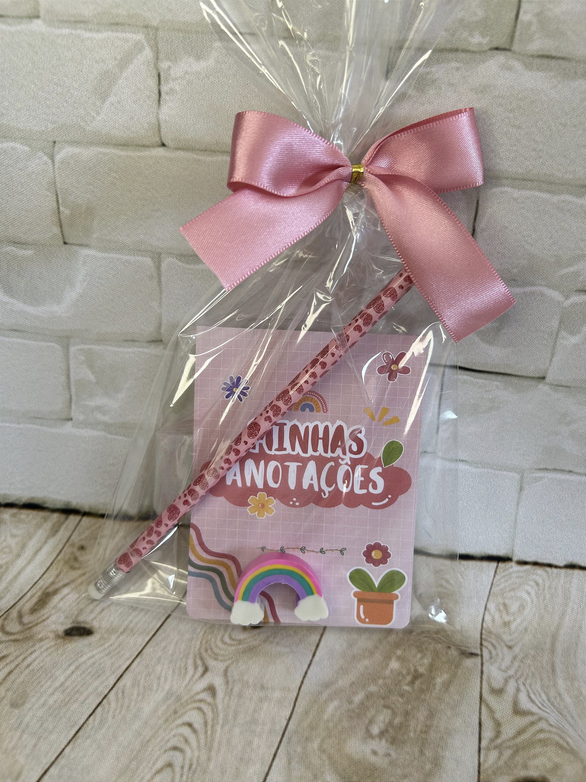 Bloquinho de anotações tamanho A7 Borracha em formato de arco-íris e lápis com temática de corações (pode variar, porém na mesma temática)